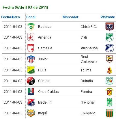 Asi se jugará la novena fecha de la Liga Postobon 2011, los partidos que aparecen con Everyfutbol.com, serán los partidos que se trasmitirán en esta nueva jornada de Fútbol Colombiano.
